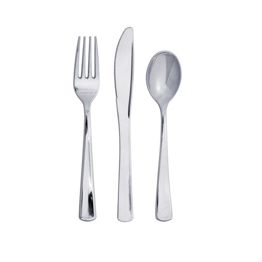 Cubiertos Desechables Premium Sensations Plateados – 24 unidades (8 tenedores, 8 cuchillos, 8 cucharas) 💫 Elegancia y practicidad en un solo pack: cubiertos desechables premium ideales para eventos especiales, cenas navideñas y celebraciones sofisticadas. Los cubiertos plateados de la colección Sensations combinan el estilo de una cubertería tradicional con la comodidad de los productos desechables. Con un acabado brillante tipo espejo, son perfectos para vestir la mesa en eventos como bodas, navidades, cenas formales o fiestas de empresa sin preocuparte por lavar. Miden aprox 19cm el cuchillo y tenedor y 17.5cm la cuchara.