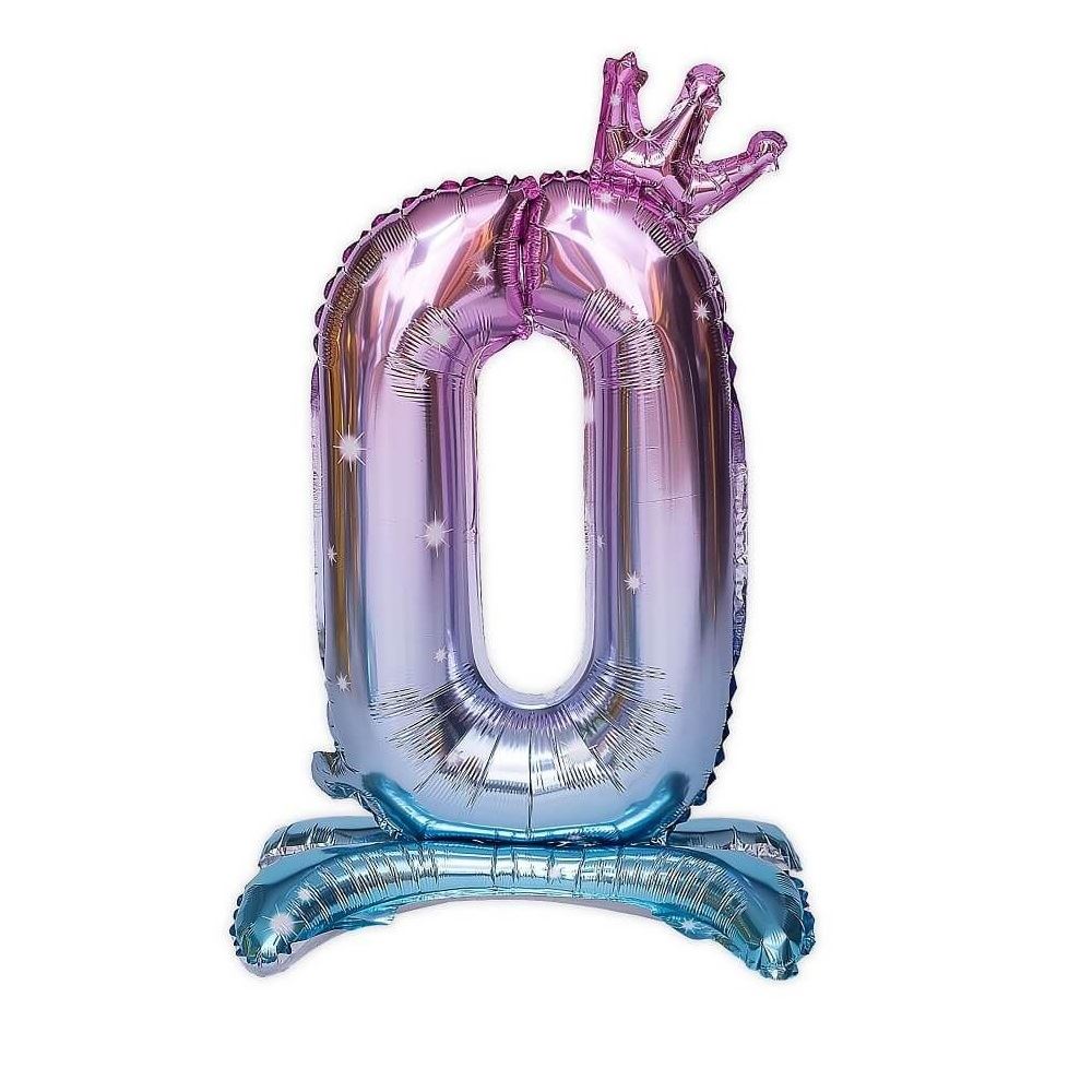 Globo de foil con Base Número 0 de color azul y rosa. Mide 80. Se mantiene de pie solo con aire. No necesita helio. Viene con una corona que lo hace ideal y decorativo. Solo se infla con aire . NO con Helio.