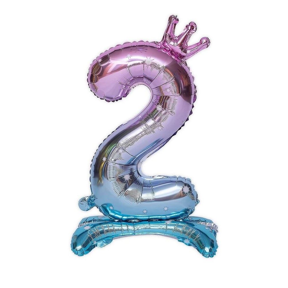 Globo de foil con Base Número 2 de color azul y rosa. Mide 80. Se mantiene de pie solo con aire. No necesita helio. Viene con una corona que lo hace ideal y decorativo. Solo se infla con aire . NO con Helio.