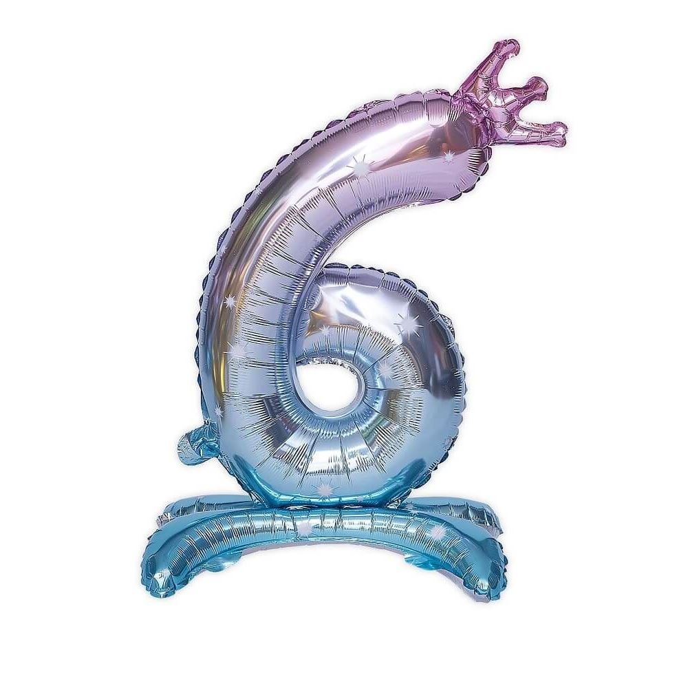 Globo de foil con Base Número 6 de color azul y rosa. Mide 80. Se mantiene de pie solo con aire. No necesita helio. Viene con una corona que lo hace ideal y decorativo. Solo se infla con aire . NO con Helio.