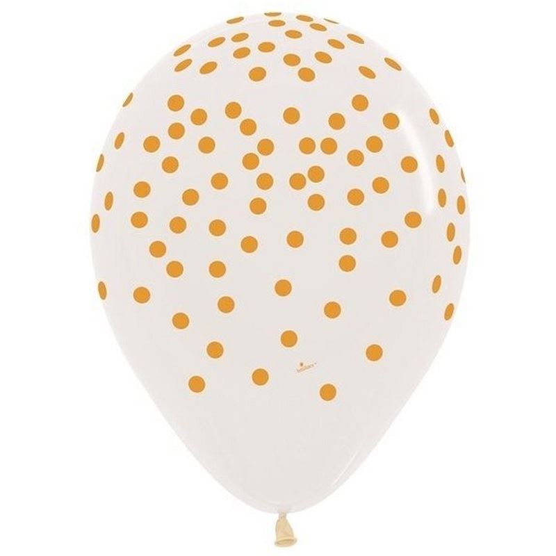 Preciosos globos de látex de gran calidad transparentes con lunares dorados. Estos globos son perfectos para decorar cualquier celebración o evento. Paquete de 12. Estos globos son aptos para aire y/o helio. Cada uno inflado mide aprox. 28cm. No se venden inflados.