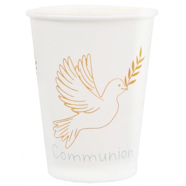 10 vasos de cartón de color blanco para Comunión con detalles en dorado. Contiene 10 unidades. Capacidad 27cl