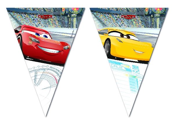 Banderín de plástico reutilizable con imágenes de los personajes de Cars, Rayo McQueen, Mate y Sheriff. Ideal para decorar fiestas temáticas Cars 3.