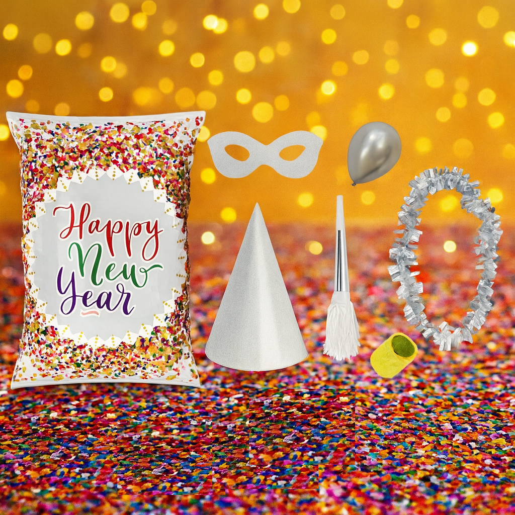 🎊 Dale la bienvenida al nuevo año con energía, color y elegancia gracias a esta práctica y completa bolsa de cotillón plateada. ¡Porque el Año Nuevo merece ser celebrado con estilo!