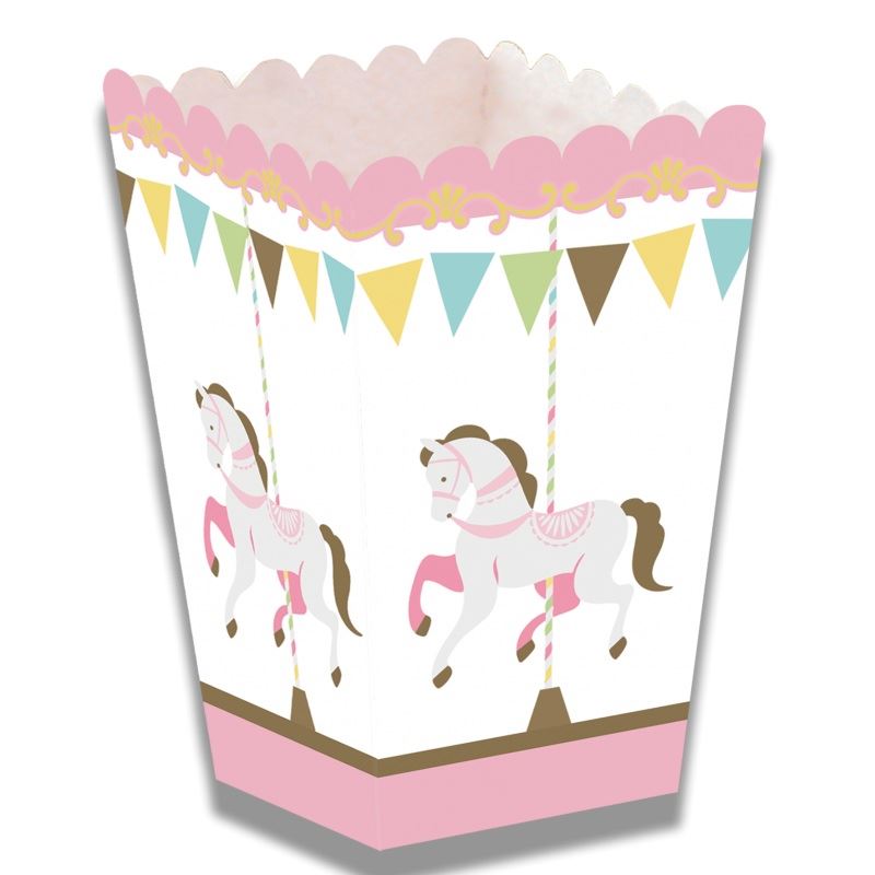 Crea una mesa dulce de ensueño con estas cajas para palomitas estilo Carrusel Rosa. Su diseño presenta caballitos de tiovivo en tonos pastel, guirnaldas de colores y un acabado superior ondulado en rosa, perfecto para añadir un aire romántico y clásico a cualquier celebración.