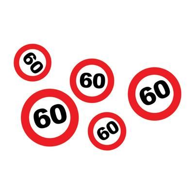 Confeti de papel con forma de señales de tráfico con el número 60, en varios tamaños.