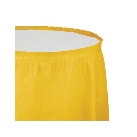 Una falda de mesa de plástico reutilizable, con cinta adhesiva para su colocación. Mide 74 x 420cm aprox. Se puede cortar para adaptar a cualquier mesa.