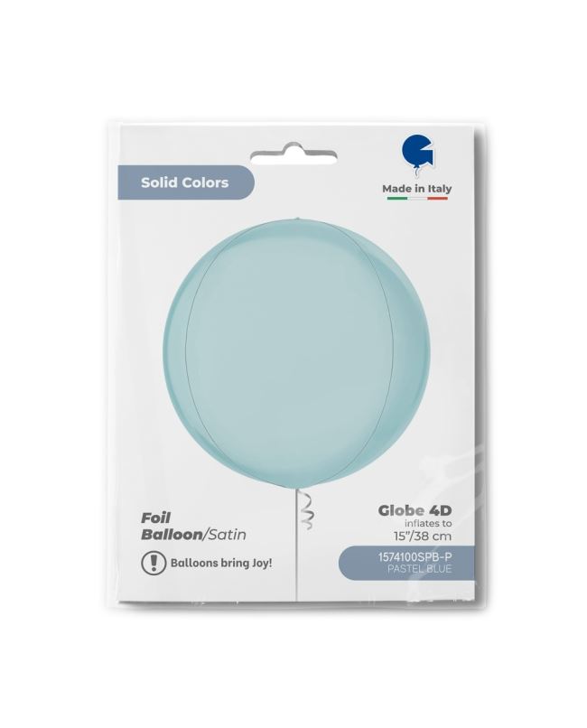 El globo foil 4D azul pastel satinado es un globo decorativo con forma de esfera perfecta, ideal para crear volumen y aportar un acabado suave y elegante a cualquier decoración de fiesta.