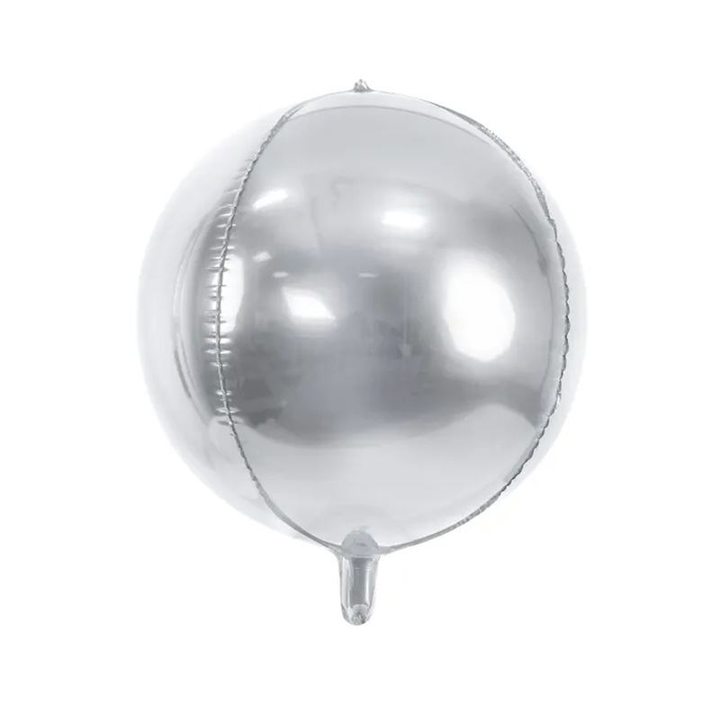 Globo foil esférico plata 40 cm con acabado metálico espejo. Perfecto para inflar con aire o helio y decorar fiestas elegantes y modernas. Ideal para cumpleaños y eventos.