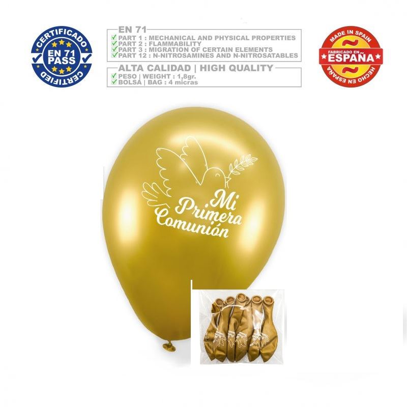 Celebra un momento único con estos globos dorados de “Mi Primera Comunión”. Su acabado metalizado aporta un toque elegante y sofisticado, ideal para crear una decoración cuidada y especial en cualquier celebración.