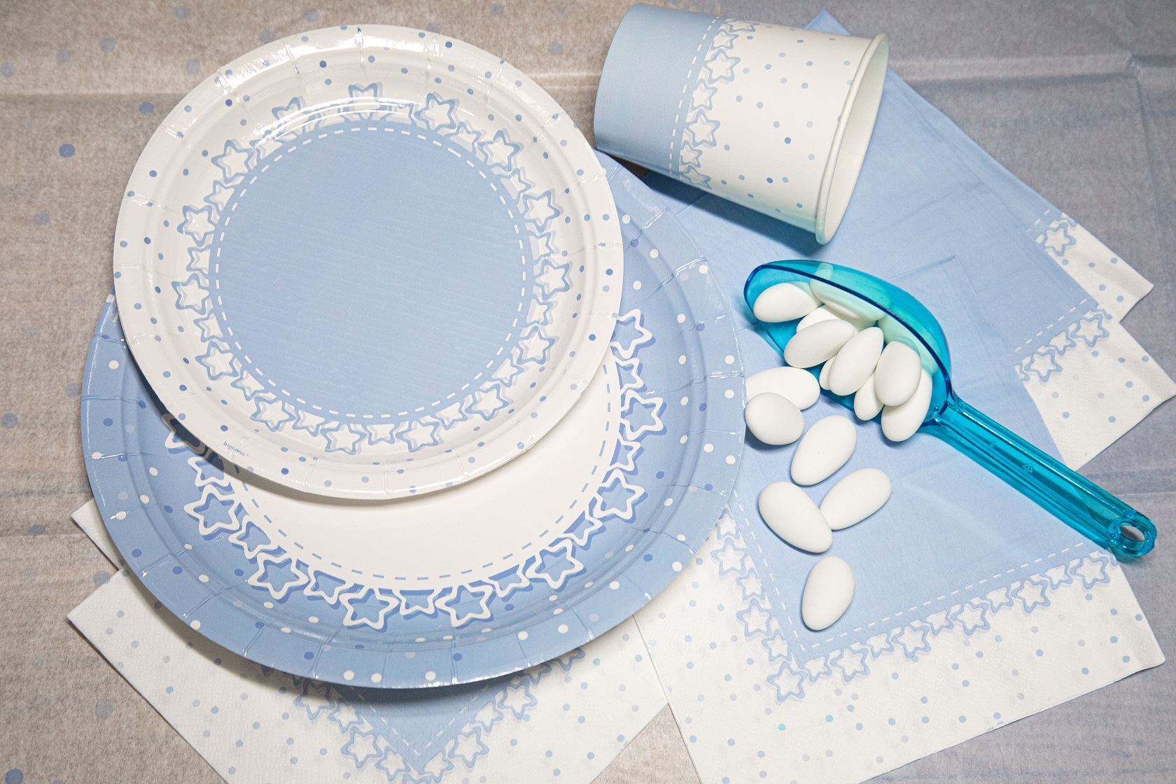 Platos de cartón de lo mas monas. De color azul con blanco con estrellas. Vajilla desechable para eventos de niños, bebes, cumpleaños, Baby Shower. Contiene 8 unidades. Miden 18cm