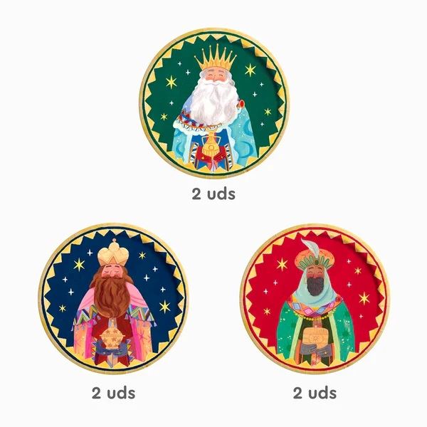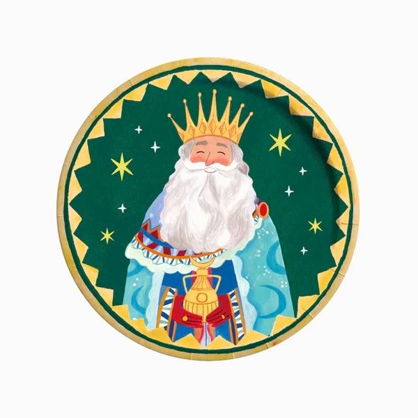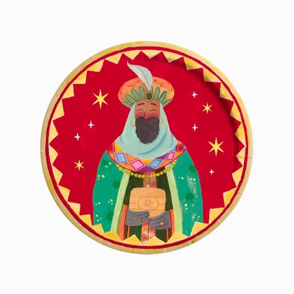 Platos de cartón de Ø 23 cm con ilustraciones exclusivas de los Reyes Magos (Melchor, Gaspar y Baltasar). Diseñados en colores vivos y detalles dorados, son perfectos para celebrar la víspera de Reyes, desayunos familiares, meriendas después de la cabalgata o cualquier mesa temática navideña.