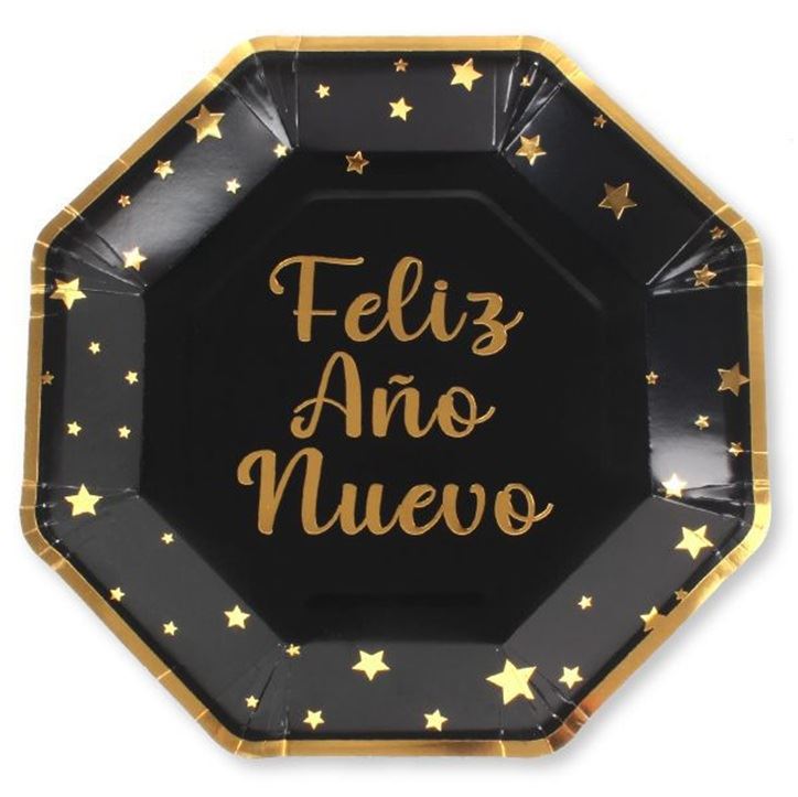 Platos de Año Nuevo en color negro con elegantes letras en color dorado. Son una elección brillante para tus celebraciones. Hechos de cartón de alta calidad, tienen un diámetro de 23cm y presentan un diseño octagonal, lo que les añade un toque especial. Pack de 6 unidades. Ideales para servir tus deliciosos manjares en la víspera de Año Nuevo. Estos platos desechables son prácticos y a la vez elegantes, lo que hace que tu mesa luzca espectacular sin tener que preocuparte por lavar la vajilla después de la fiesta. Con ellos, podrás celebrar con estilo y comodidad. No aptos para microondas.