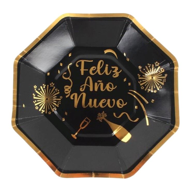 Platos de Año Nuevo en color negro con elegantes letras en color dorado. Son una elección brillante para tus celebraciones. Hechos de cartón de alta calidad, tienen un diámetro de 18cm y presentan un diseño octagonal, lo que les añade un toque especial. Pack de 6 unidades. Ideales para servir tus deliciosos manjares en la víspera de Año Nuevo. Estos platos desechables son prácticos y a la vez elegantes, lo que hace que tu mesa luzca espectacular sin tener que preocuparte por lavar la vajilla después de la fiesta. Con ellos, podrás celebrar con estilo y comodidad. No aptos para microondas.