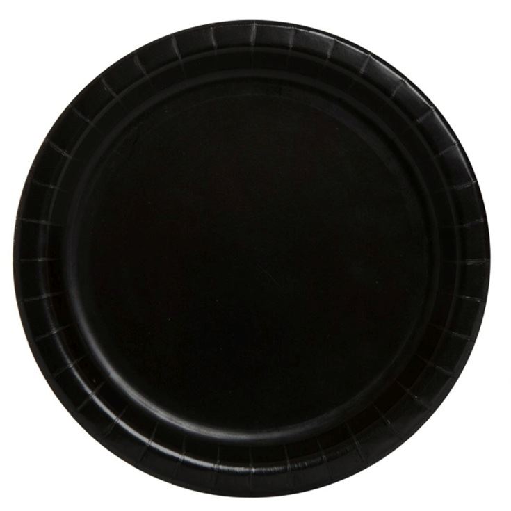 Platos redondos negros de cartón de 22,5 cm, resistentes, elegantes y prácticos. Perfectos para fiestas, cenas temáticas y celebraciones con estilo.