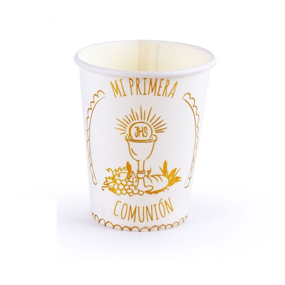 Los vasos de cartón “Mi Primera Comunión” con diseño de cáliz dorado son la opción ideal para completar la decoración de mesas en celebraciones de comunión.