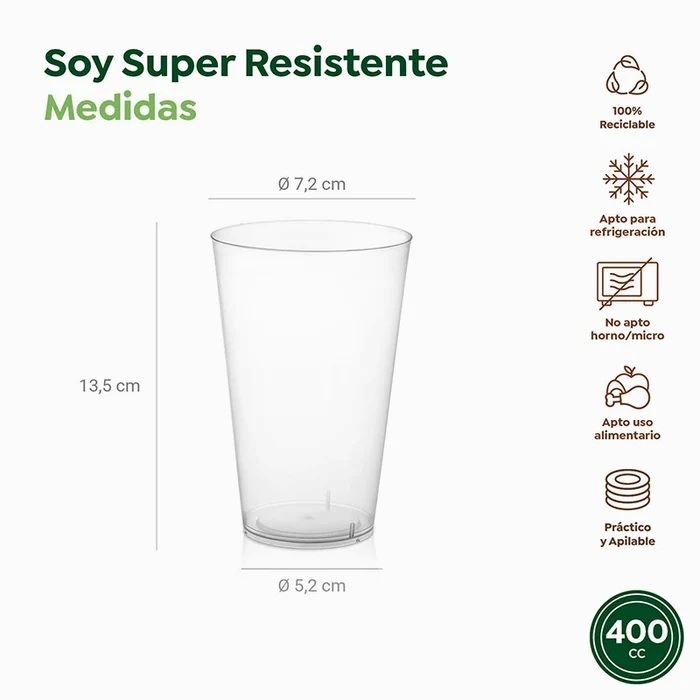 ✅ Características principales Capacidad: 400 ml (40 cl) Material: Plástico PP (polipropileno) Color: Transparente Formato de venta: Pack de 10 unidades Tipo de uso: Reutilizable (resistentes y lavables) Apto para: Bebidas frías o templadas (no apto para microondas)