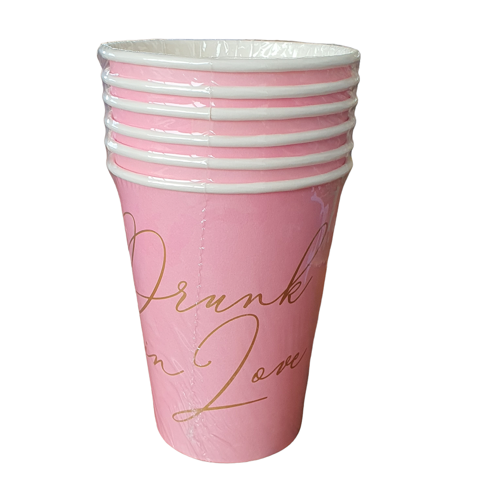 Vasos de cartón en color rosa y una frase grabada en color dorada "Drink in love", elige estos vasos originales para celebrar y brindar con ellos unos días antes de la boda en una comida o cena con amigas. Contiene 6 unidades. Capacidad 360ml.