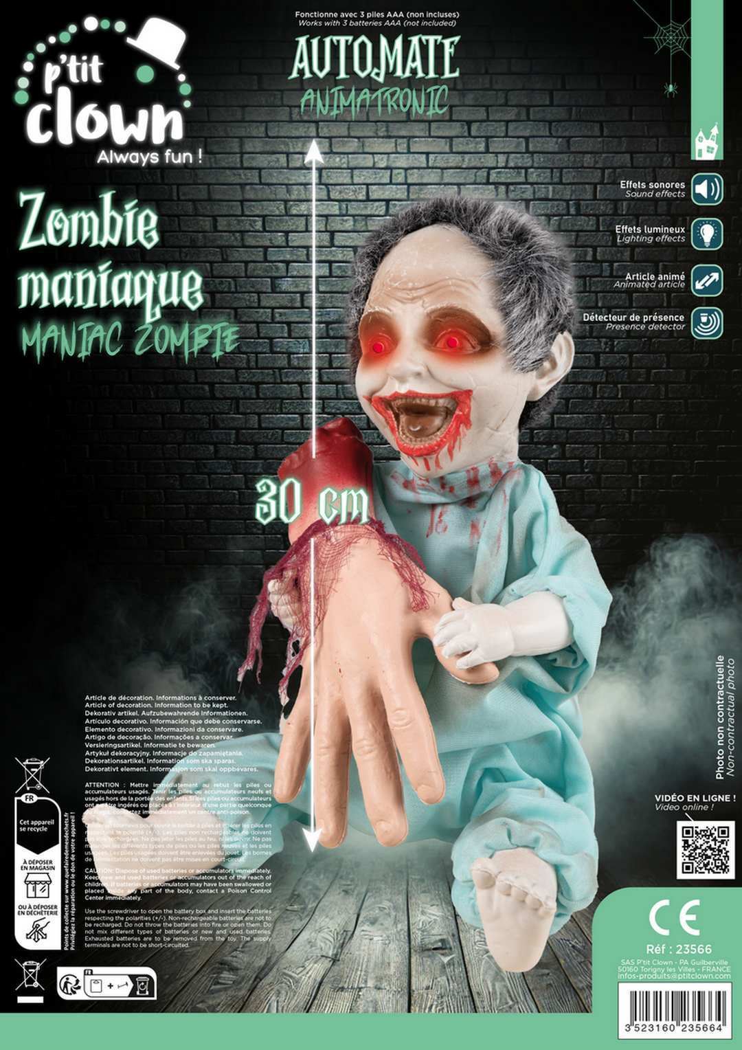 Bebé Zombi con Mano Desmembrada Animado – Sonido y Luz ¡Haz que tu fiesta de Halloween sea realmente terrorífica con este bebé zombi animado! Este espeluznante decorado se activa con luz y sonido, ofreciendo una experiencia aterradora que captará la atención de todos los invitados. Características: Tamaño: 30 cm de altura. Animación: Efectos de sonido espeluznante y ojos rojos brillantes. Diseño terrorífico: Un zombi que sostiene una mano desmembrada con detalles realistas y ensangrentados. Función: Perfecto para decorar cualquier rincón o como parte de un animatronic en tu fiesta. Este bebé zombi es el complemento ideal para crear un ambiente de miedo en Halloween o en cualquier fiesta temática de terror. ¡No te lo pierdas y sorprende a tus invitados!
