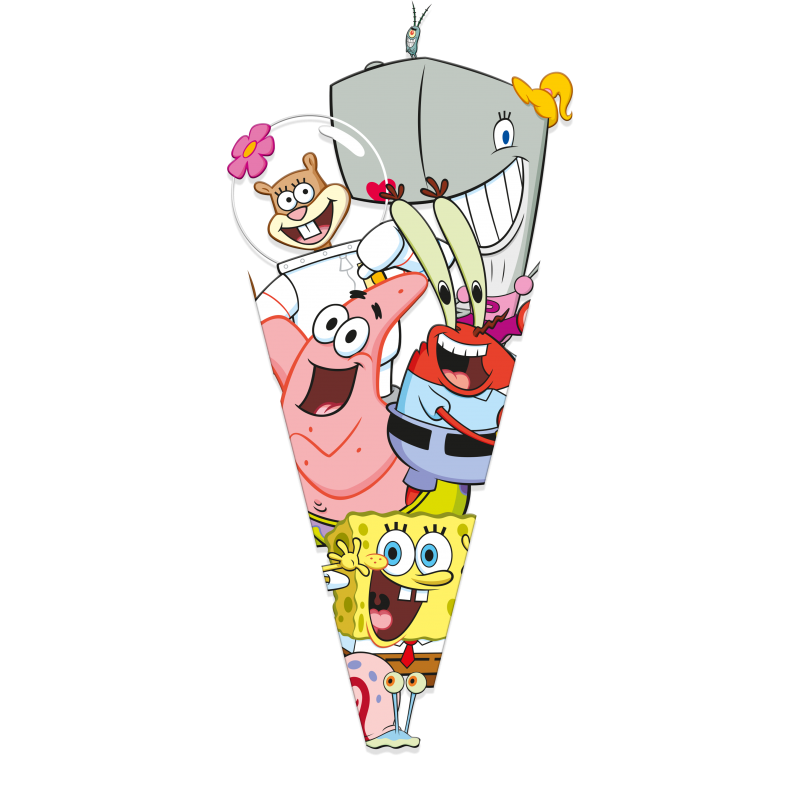 Esta bolsa en formato cono con diseño Bob Esponja permite ver el contenido y aporta un toque divertido a la mesa dulce o al reparto final.