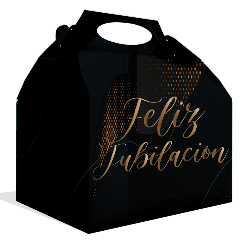Caja Regalo Feliz Jubilación con Asa (20 x 16 x 11 cm) es una caja de cartón rígido con diseño elegante en negro y dorado, perfecta para presentar regalos, detalles o recuerdos en celebraciones de jubilación.