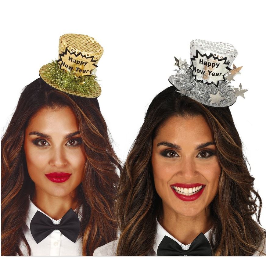 Diadema Happy New Year con forma de chistera. Disponibles dos modelos surtidos en dorado y plateado. Talla Adulto. Para estas fechas Navideñas y de Fin de Año.