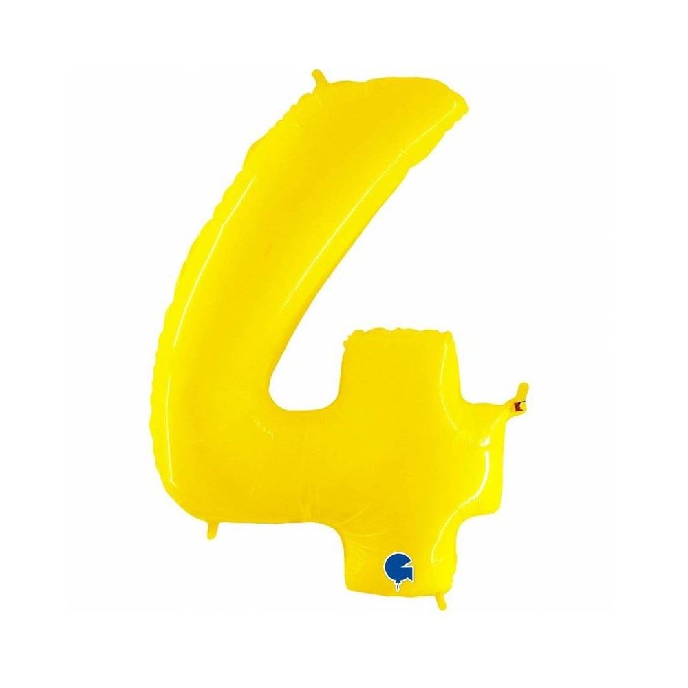 Globo número 4 de color amarillo neón. Un globo grande de 95cm para eventos especiales. Se puede inflar con helio o con aire. Se envía sin inflar.