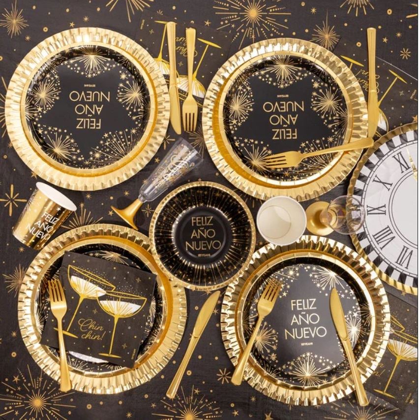 Estos platos "Feliz Año Nuevo Dorados Destellos" son ideales para dar la bienvenida al nuevo año con estilo. Cada plato tiene un diámetro de 23 cm y está decorado en elegantes colores negro y dorado. Con un diseño festivo y sofisticado, estos platos son perfectos para servir tus deliciosas creaciones culinarias en tu fiesta de Año Nuevo. Además, al ser desechables, te facilitan la limpieza después de la celebración, permitiéndote disfrutar al máximo de la ocasión sin preocupaciones.