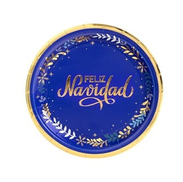8 Platos Feliz Navidad en color azul noche. Cada paquete contiene 8 platos de 18 cm de diámetro. Están decorados con un mensaje de "Feliz Navidad" y son perfectos para dar un toque festivo a tu mesa durante las celebraciones navideñas. ¡Agrega un toque de elegancia a tus fiestas navideñas con estos encantadores platos azules!
