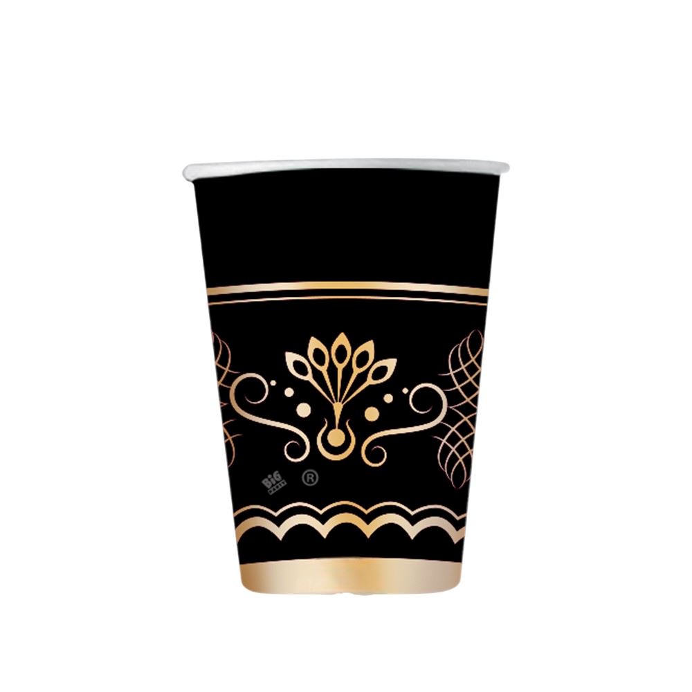 Vasos Royal Black Gold 250 ml (Pack 6). Diseño en negro y dorado metalizado en cartón rígido. Ideales para bebidas frías o calientes y perfectos para mesas elegantes.
